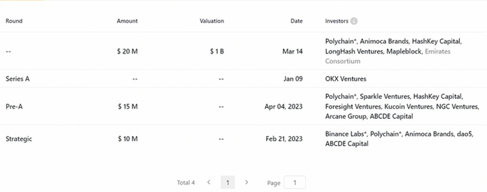23年2月为第一轮融资,获得了由Binance Lab 和 Polychain 共同领投的1千万美金。
