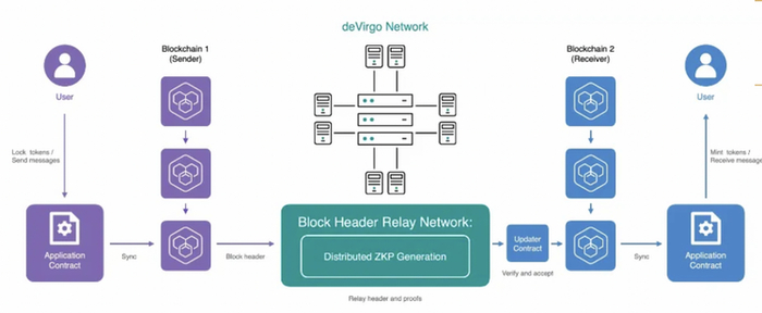 zkBridge作为Polyhedra Network的核心产品,它被设计为一个无需信任的跨链桥。zkBridge 使用 zkSNARK 使证明者能够有效地让接收的链确认发送者链上发生了某种状态转换。它由区块头中继网络和更新合约组成。通过模块化设计,zkBridge实现了几项有用的功能,包括消息传递、代币转移以及在不同链上的状态变化上运行的其他计算逻辑。