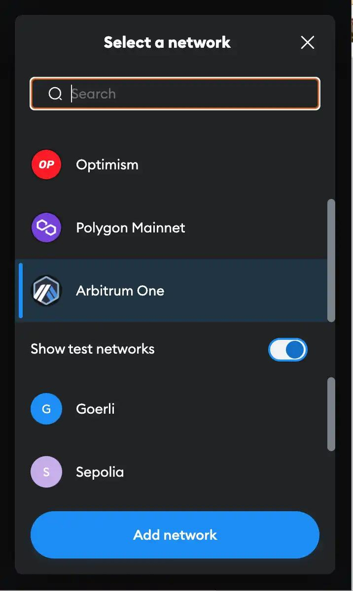 以 MetaMask 为例,打开 MetaMask 扩展,单击扩展程序左上角的网络选择按钮,然后单击「添加网络」。