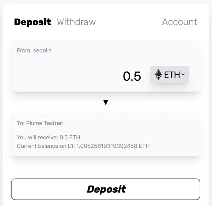 最后,使用Plume 测试网桥将 SepoliaETH 桥接到 Plume 上。