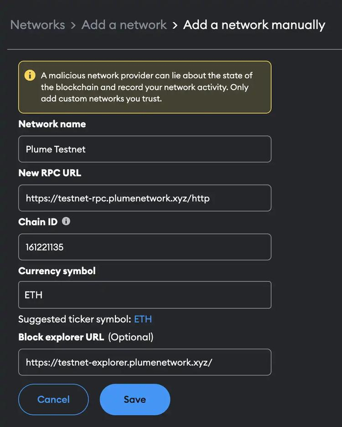 点击此处复制 Plume 网络参数,点击「保存」,然后单击「切换到 Plume 测试网」。