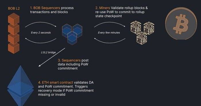 最初,BOB 在 OP 堆栈上启动,可以通过合并挖矿协议(比特币重质押)继承比特币的安全性,其最终目标是直接在比特币 L1 上结算,之后可能会通过 ZK Rollups 进行全状态验证。