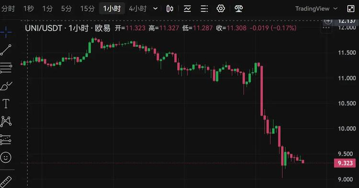 消息爆出后,Uniswap 平台的原生代币 UNI 闻声暴跌,从 11.2 美元一路下跌至 8.9 美元,短时跌幅超过 20%,截至发稿时报价为 9.3 美元。