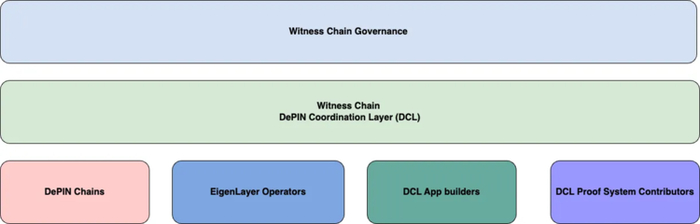 Witness Chain 是一个专为去中心化物联网设备设计的网络,它包含了很多组件,比如 DCL (DePIN Coordination Layer),其实也就是提供了一些 DePIN 生态所需要的基本服务,比如链本身的安全性、节点的带宽、物理位置等。他们把这些基本服务称为瞭望塔(Watchtowers),用来测量上述的这些数据,然后可以在 DCL 层中生成有效的证明和被使用。这很像 Witness Chain 中 Witness 的字面意思:「见证」。