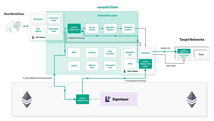 预言机协议 eoracle 这个名字来自于 (e)thereum + oracle。他们称自己是以太坊上第一个「原生」的预言机,可能是因为该预言机的安全性是由质押的 ETH 保证的,而像 Chainlink 等预言机,安全性由 Chainlink 的节点网络和其代币 LINK 来保证的,安全假设不一样。