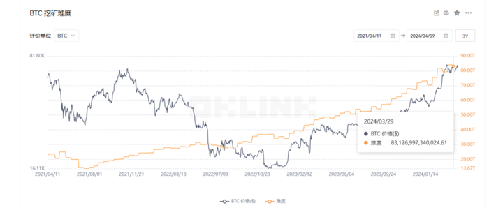 而截至最新一次比特币于区块高度 836640 进行的挖矿难度调整——挖矿难度达 83.13T,相比一年前几乎翻了近一倍。