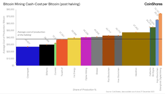 根据 CoinShares 研究报告显示,10 天后减半完成之际,矿工的比特币生产平均成本或将大幅上升,成本中位数为 42000 美元以上,不过由于近 2 个月来比特币价格的飙升,目前绝大部分矿工的生产成本都低于市场价格。