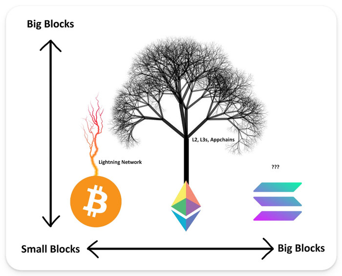 我们不再称这些派别为大区块派或小区块派,如今人们更喜欢找到更现代的派别来认同,通常由特定的第一层(Layer1)定义。尽管如此,这两个阵营表达的不同哲学观点存在于每个Layer1派别的文化和信仰体系中,无论他们是否意识到这一点。在现代,小区块派与大区块派的辩论在以太坊与Solana的辩论中继续得以体现。Solana阵营表示以太坊的成本太高、速度太慢,无法让全球用户上链。除非交易变得即时且免费,不然消费者不会使用加密资产,因此我们需要尽可能多地将容量设计到Layer1中。