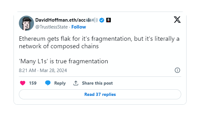 译文:以太坊因其碎片化而备受批评,但它实际上是一个由组合链组成的网络。“许多L1”才是真正的碎片化。