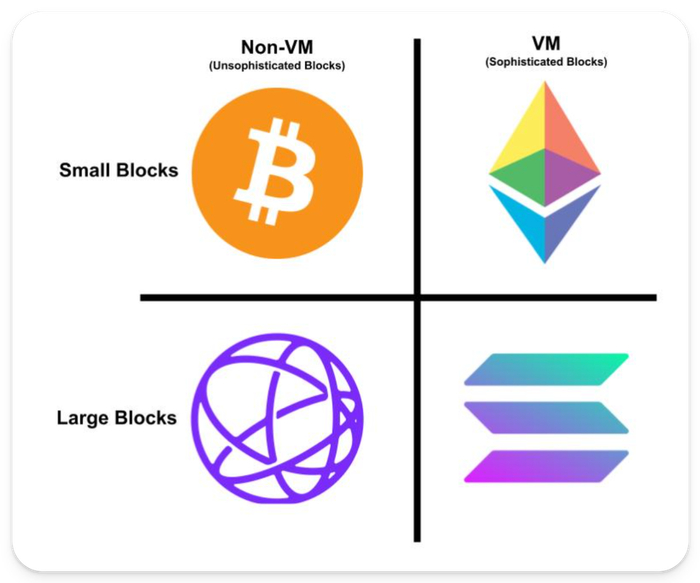 虽然比特币和以太坊都是“小区块”哲学链,但虚拟机的增加范围仍然在这两个社区之间造成了巨大的分歧。快进到今天,你可以看到现代区块链哲学中一些最大派别之间的明显关联。