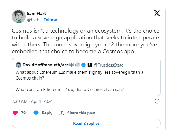 译文:Cosmos不仅仅是技术或生态系统,它代表着选择:选择构建一个独立自主、与其他应用程序实现互操作的应用。你的Layer2越独立自主,就越能体现出成为Cosmos应用的选择。
