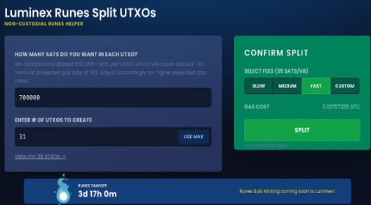 提示:通过向新钱包发送你愿意投资每个符文的比特币金额来创建多个 UTXO。这样,你就可以快速投资多个 Token,而无需等待上一个交易完成,或者使用 Luminex。