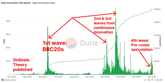 Ordinal Inscriptions 在 2022 年 12 月推出。但第一次主要热潮是在 2023 年 5 月推出 BRC20 时出现的。自由铸造的 BRC20 迅速增长,但随着开发者的持续建设,第二和第三波于 2023 年底到来。