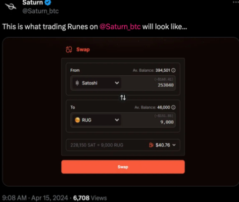 Saturn: 用于比特币资产的 AMM/ 订单簿交易平台。在符文发布期间可能没有足够的流动性。