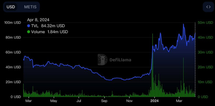 5、最后一点就是其链上生态的活跃性和想象力了。目前看,Metis 整体 TVL 以及 Volume 都有很强的增长,并且 Metis 也一直在积极地建设生态。