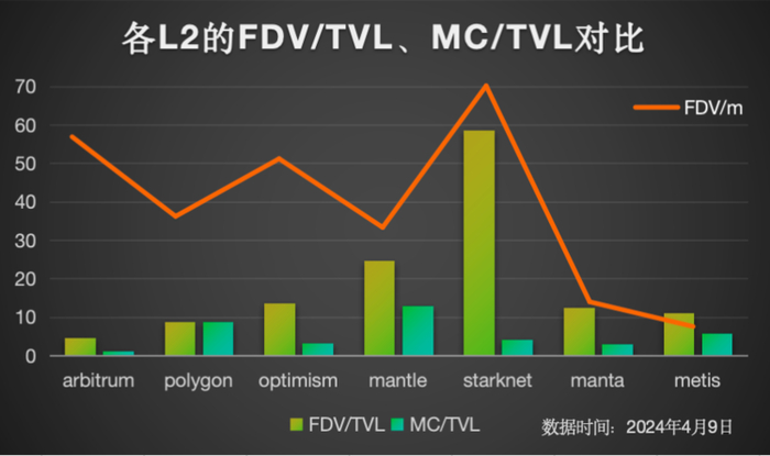 首先,我们根据 FDV 和 MC 与 TVL 的对比来筛选一个标的:可以发现,Arbitrum、polygon、optimism、manta、metis 的 FDV/TVL 值相对比较低,并且这其中 Metis 的市值目前是最低的,上升空间也最大。