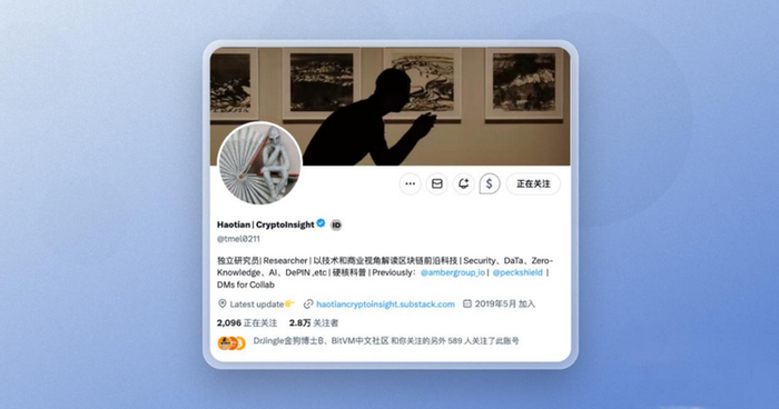 大家好,我是Haotian,是一位硬核科普作者,Web3独立研究员,此前先后就职于PeckShield和AmberGroup两家行业头部公司,目前全职运营个人X品牌Haotian|CryptoInsight,定位为以技术+商业视角解读区块链前沿科技,致力于传播通俗易懂的Web3底层技术知识和行业发展商业观察。