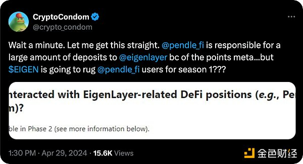 Pendle 等 DeFi 协议因推动 EigenLayer 的参与而闻名,却发现自己被排除在第一轮空投之外。 这一决定在网上引起了很大的阻力,因为这些协议提供的机会为 EigenLayer 带来了大量的存款。