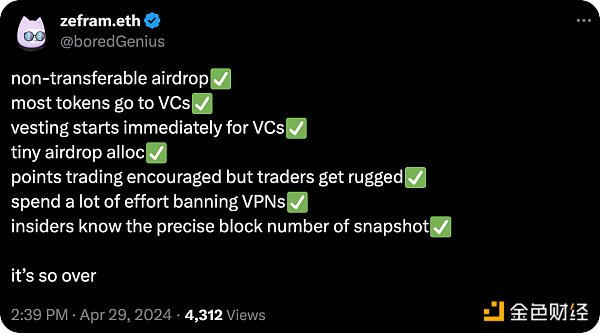 此外,以风险投资为中心的 EIGEN 分配也有很多受挫的情况。 随着立即兑现激活,不少 EigenLayer 常规用户表示,他们感觉自己吃亏了。