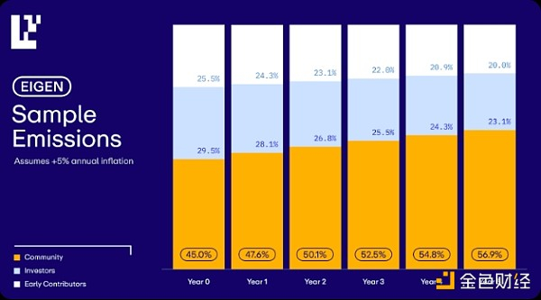 除了指定用于质押的总供应量的 15% 之外,还有 30% 的初始代币供应量被保留用于资助 EigenLayer 开发并纳入社区分配,在 Eigen 基金会和直接社区控制之间按 50/50 分配。