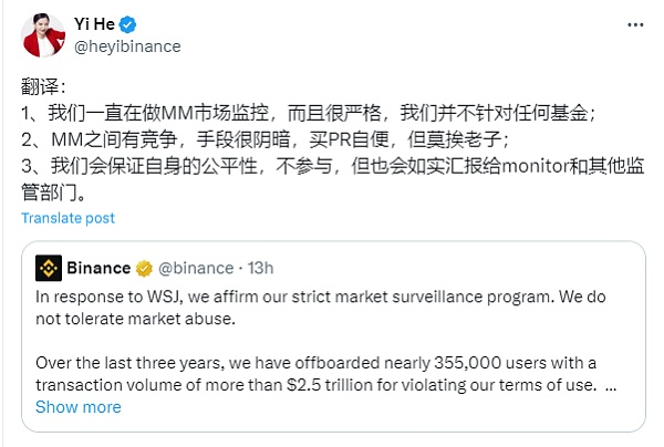 随后,币安联合创始人兼首席客户服务官何一对币安的回应进行了解读,强调币安一直在做 MM(做市商)市场监控,而且很严格,但并不针对任何基金,做市商之间有竞争且手段很阴暗,暗示有些做市商存在 PR 行为,但不要牵扯到币安,币安会保证自身的公平性,不参与,但也会如实汇报给 monitor 和其他监管部门。何一还补充称: