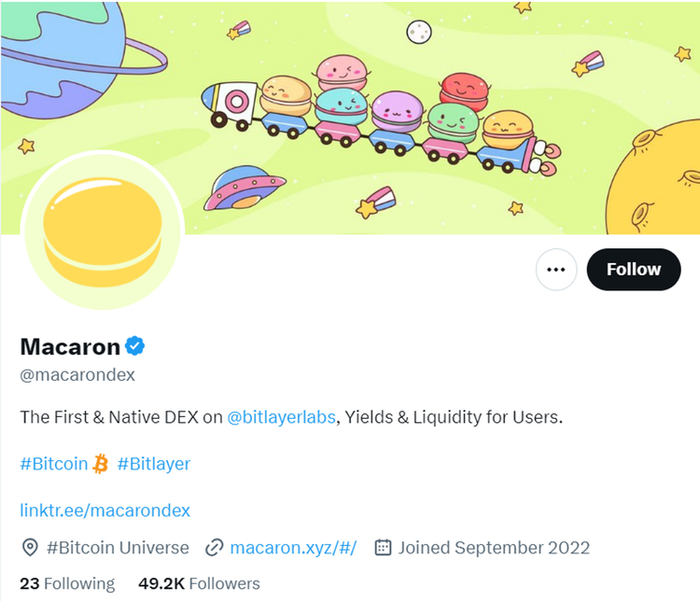 截止 5 月 10 号,Bitlayer Dapp Leaderboard 上的排名第 2,仅次于稳定币 bitSmiley。推特上已经有 49.2k 关注者,热度较高。