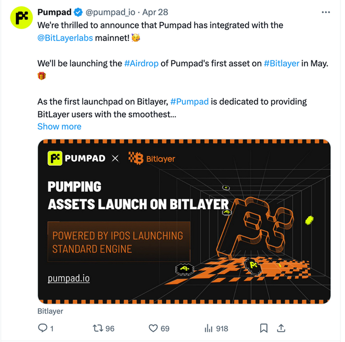 Pumpad 是 Bitlayer 原生的 Launchpad 项目,据官方称,Pumpad 是 BTC 生态系统的一站式 Launchpad 根据 IPOS 标准发行 VGA 资产。资产发行后,Pumpad 可以帮助发行方自动添加 DEX 的流动性,并部署自动做市商协议。可以说,Pumpad 是一个为项目方提供全周期服务的发行平台,而不仅仅是提供 IDO 服务。