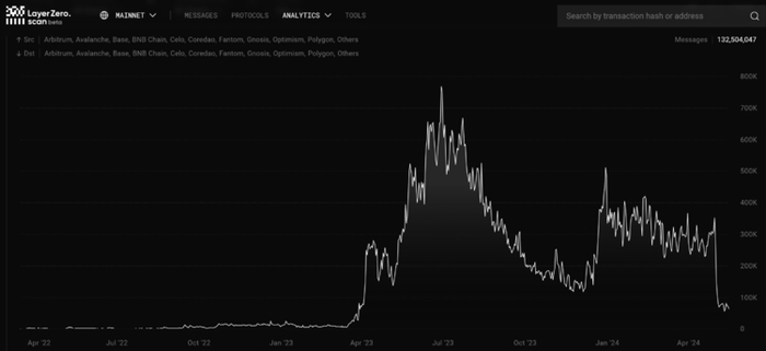 这可以从正在进行的 LayerZero 空投中看出,空投消息已经炒作了一年多,最近发布了第一个快照。如下图所示,该协议的用户活跃度随后立即下降,因为投机用户不玩了,只剩下‘真正的’用户。