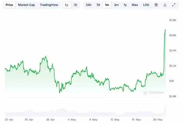 受此消息影响,以太坊价格在多日低迷后,一夜苏醒,一度暴涨至3700美元上方,24小时涨幅超过20%。