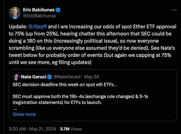与此同时,Bloomberg Intelligence ETF 分析师 Eric Balchunas 表示,现货以太 ETF 批准的几率从原本的 25% 提高到 75%,今天下午听到有人议论,受各方压力的影响 SEC 可能会对此做出 180 度的转变。Balchunas表示,加密货币日益政治化是这种突然转变背后的驱动因素。