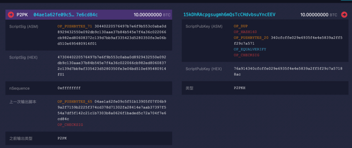 下面是一个典型的 P2PK 类型的交易,其中 04ae 开头的地址想要给 15kD 开头的地址转 10 个 BTC。04ae 地址的账户需要向链上的其他人表明自己确实拥有这个账户的使用权(拥有私钥),那么他在这个交易中需要提供一个签名(ScriptSig)来证明自己的身份。