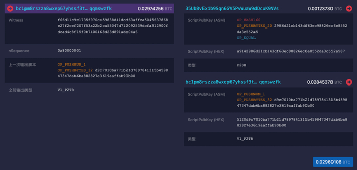 下面是一个 P2TR 交易,可以看到这个交易多了一个 Witness 部分。它的作用是用来验证交易的合法性。使用 Witness 代替 ScriptSig 之后,验证合法性的方式还是一致的,即通过使用公钥来解密 Witness 的签名,验证交易的内容是否一致。只有节点需要验证交易合法性的时候才会去请求 Witness 的信息。现在免费使用 ZAN Node 服务(访问 ZAN.TOP)即可稳定高速的连接到 BTC 网络。