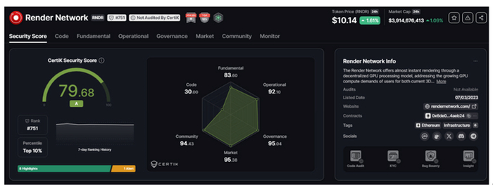 区块链安全机构CertiK对Render的评分为79.68,在该公司评估的所有加密货币中排名第751位。