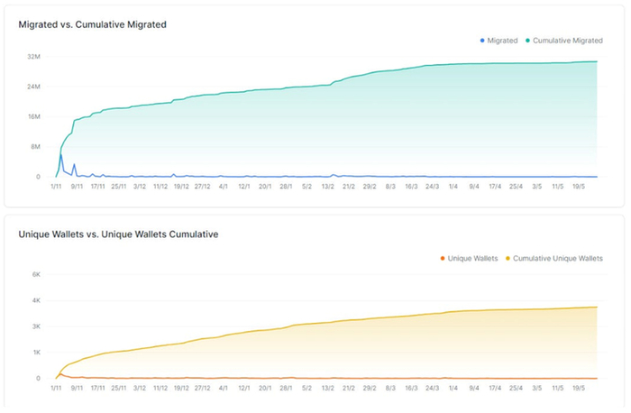 将 RNDR ERC-20 代币升级为 RENDER SPL 代币时,兑换比率为 1:1。1 RNDR = 1 RENDER。兑换仍在进行中。当前统计的数据为: