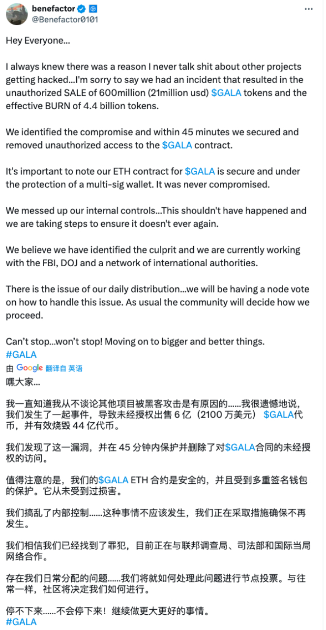 (9)5月20日,Web3 游戏平台 Gala Games 遭攻击,损失约 2180 万美元。攻击者铸造了 50 亿枚 GALA 代币,价值超过 2 亿美元,之后迅速抛售 5.92 亿枚 GALA,获得 5952 枚 ETH。5 月 22 日,根据链上记录和 Gala Games 在 Discord 的声明,黑客返还了 5913.2 枚 ETH。