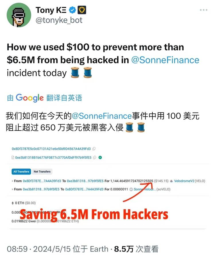 (7) 5月15日,Optimism链上Compound fork项目Sonne Finance因合约漏洞遭受攻击,损失达2000万美元。事件发生后,Seal 贡献者通过向市场添加价值约 100 美元的 VELO,挽救了约 650 万美元。此次攻击利用了新加入市场的漏洞,在市场创建后的两天内,攻击者利用多签钱包和时间锁功能执行关键交易,成功操纵了市场的抵押因子(c-factors)。