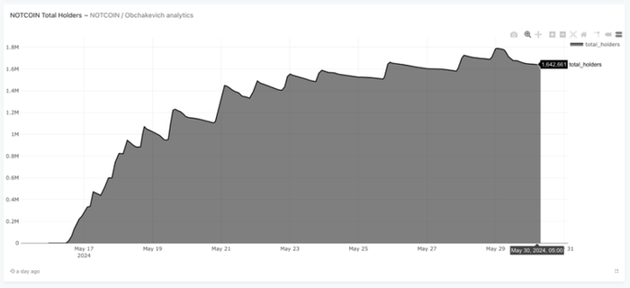 根据 TON 链上数据,NOTCOIN 在 TGE 之前约有 22 万 $NOT holders,上所之后稳步上升,目前 holders 总数已超过 160 万。