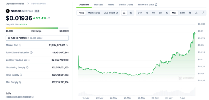 确认发币后,市场给予 NOTCOIN 的反馈也超出了大多数人的预期。NOTCOIN 的代币 $NOT 于 5 月 16 日登陆多家一线交易所,并于 6 月 2 日创下 0.021 美元的新高。$NOT 总量 1027 亿,全流通,目前 FDV 约为 19.9 亿美元,市值排名前一百。