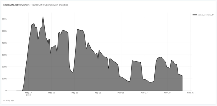 我们使用 $NOT TGE 及之后 5 天的活跃持有者作为 NOTCOIN 日活的估算,可以看出数据整体呈现下降趋势,从一开始的 50 万逐渐下降至 20 万。