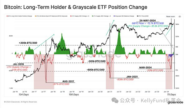 在过去的两次牛市中,长期持有者的净分配率达到了83.6万至97.1万比特币/月。目前,来自他们的净抛售压力在3月底达到了51.9万比特币/月的峰值,其中约20%来自灰度ETF的持有者。