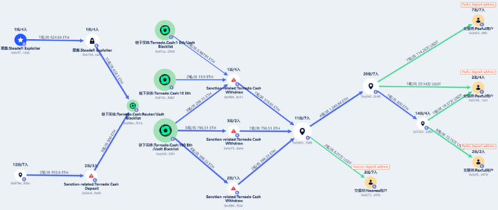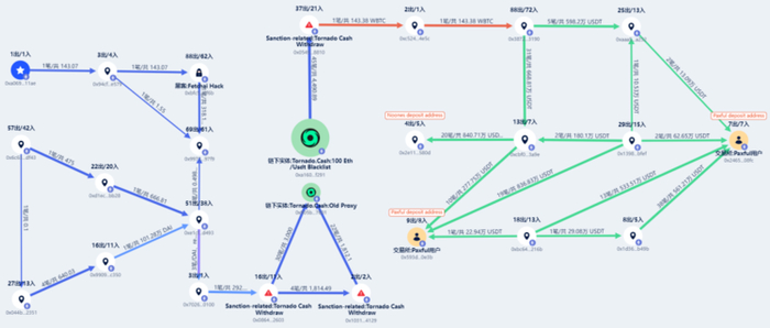 Lazarus Group通过这几个地址进行了资金混淆、分散、归集等操作。例如,部分资金通过跨链到比特币链上,再通过一系列转移跨回以太坊链上,之后通过混币平台进行混币,再将资金发送至提现平台。