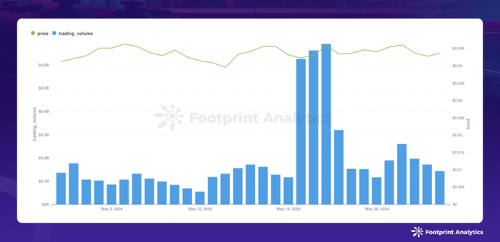 2024 年 5 月,以太坊的表现因 SEC 批准现货以太坊 ETF 的初步申请而得到显著提振。区块链游戏代币的总市值达到 201 亿美元,环比上涨 6.7%。然而,尽管市值有所增长,行业在用户参与度方面却经历了有趣的转变,交易量有所下滑,但每日活跃用户数量却创下新高。此外,迷你游戏和游戏 bots 的日益流行正逐步改变游戏行业的格局。