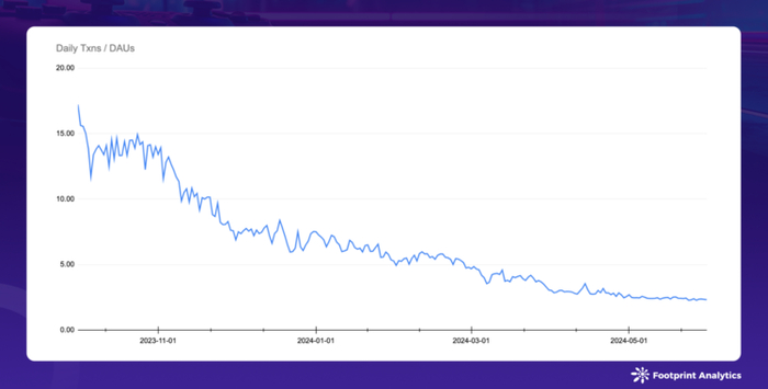 在观察了 5 月份的市场动态后,我们注意到一个颇为有趣的现象:区块链游戏中每日交易量的下降趋势与每日活跃用户的上升趋势并存。自 2023 年 10 月以来,每日交易量与每日活跃用户的比率已从 17.2 逐步降至 2.3。