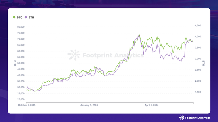 2024 年 5 月,比特币自 4 月底的低点强势反弹,从月初的 60,653 美元攀升至月底的 67,606 美元,涨幅达到 11.5%。与此同时,以太坊也展现出强劲的复苏态势,其价格在同期内从 3,011 美元上涨至 3,778 美元,涨幅高达 25.5%。