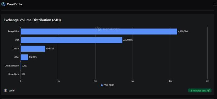 据GeniiData的数据,截至6月12日,Magic Eden的交易量为419万美元,OKX为272万美元,UniSat为65.7万美元,Magic Eden稳居首位,大约占据54%的市场交易份额。
