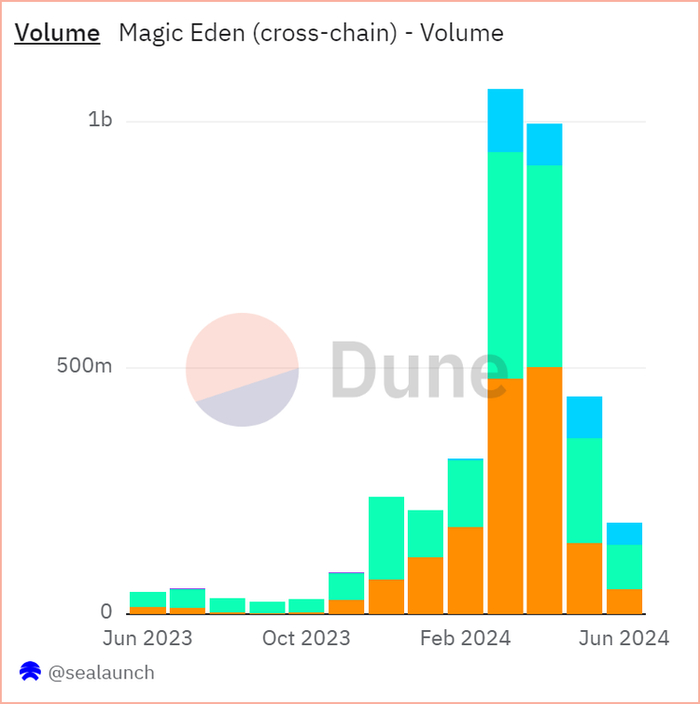 Magic Eden跨链交易量。蓝色代表以太坊,橙色代表比特币,绿色代表Solana,紫色代表Polygon。