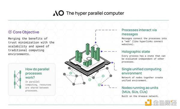 AO 是基于 Arweave 的分布式、去中心化、面向参与者的计算系统。AO 的核心目标是提供一种无需信任和协作、没有实际规模限制的计算服务,为与区块链相结合的应用程序提供新范式。与其他高性能区块链相比,AO 支持存储大量数据,例如 AI 模型。与以太坊不同,AO 允许任意数量的并行进程在计算单元内同时运行,通过开放消息传递进行协调,而无需依赖集中式内存空间。
