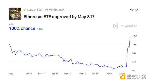 这项批准令人意外。Polymarket 是一个去中心化预测市场平台,截至 5 月 5日,该平台预测以太坊 ETF 在 5 月 31 日之前获得批准的几率为 6% 。
