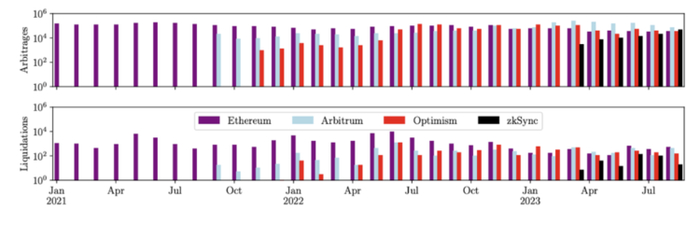 根据Christof Ferreira Torres等人的研究,其回放了 Rollups 上的交易,得出的结论是 Arbitrum, Optimism, Zksync 是存在链上非恶意MEV行为的,三个链目前总计产生了$580m的 MEV 价值,足以作为一个值得关注的收入来源。