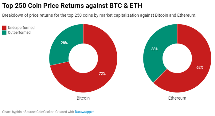 与比特币和以太币两大资产相比,前250市值代币的表现令人失望,这反映出这两大资产的估值过高,而被该领域的许多参与者忽视。这进一步打压了市场情绪。